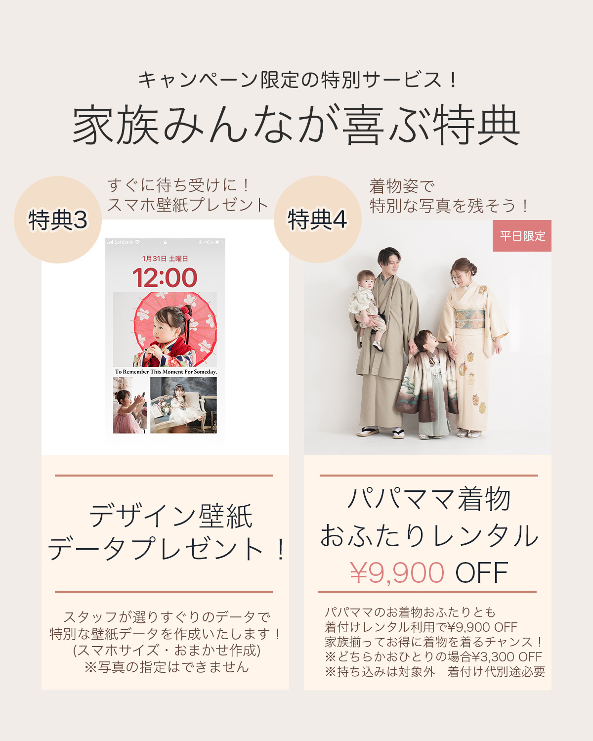 | ロケ撮影 | ¥5,500〜(多賀神社) ※詳しくは店舗にお問い合わせください | |